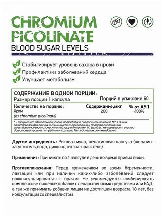 В одной порцииПиколинат хрома – комплексная пищевая добавка, которую принимают вместе с пищей для поддержания нормального уровня хрома в организме, помогает избавиться от лишнего веса, регулирует содержание сахара в крови, предупреждает развитие атеросклероза и положительно действует на нервную систему. Именно поэтому пиколинат хрома активно используется спортсменами, но для женщин будет особенно полезен. Основным действующим компонентом в составе пиколината хрома является трехвалентная форма хрома. Также в него входит пиколиновая кислота, но как такового влияния на организм она не оказывает, а только улучшает усвояемость хрома. Пиколинат хрома оказывает благотворное влияние на состояние сердечно-сосудистой системы, снижает риск развития ожирения, способствует более быстрому восстановлению сил после интенсивной физической нагрузки, активизирует иммунную систему и функциональную активность головного мозга, помогает регулировать свой аппетит и, в частности, тягу к сладким продуктам, позволяет укрепить мышечную систему.