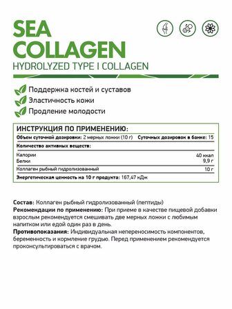 Морской коллаген (Sea Collagen) положительно влияет на функциональное состояние кожи, улучшается эластичность и упругость, способствует возмещению потерь уровня влаги и аминокислот в коже. Обладает питательным, регенеративным и заживляющим действием.