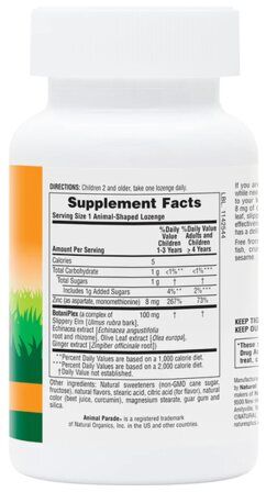 Ингредиенты: Фруктоза, натуральные ароматизаторы, лимонная кислота, стеариновая кислота, гуаровая камедь, стеарат магния, диоксид кремния и натуральные красители (свекла, куркумин, мальтодекстрин без ГМО). Без искусственных красителей и консервантов. Не содержит основных аллергенов, определенных в Законе США о маркировке пищевых аллергенов и защите потребителей. Рекомендации по применению: Принимать пищевую биодобавку ребенку нужно по 1 пастилке в день, либо в соответствии с назначениями врача-педиатра. Она не вызывает аллергических реакций. Пастилки Animal Parade Kid Zinc от Nature’s Plus — таблетки для поддержания высокого иммунитета у детей в виде забавных зверушек с ярким вкусом спелого мандарина. Пищевая добавка содержит сразу две легкоусвояемые формы микроэлемента цинка — аспартат и монометионин, а также комплекс растительных экстрактов. Препарат лишен глютена, ГМО, искусственных красителей, консервантов и ароматизаторов. Это веганский продукт, лишенный компонентов животного происхождения. Он подходит для употребления детьми, достигшими годовалого возраста. Количество пастилок в одной упаковке: 90 штук. Цинк является главным действующим веществом сладких полезных таблеток от Nature’s Plus. Он относится к эффективным иммуностимуляторам, осуществляя профилактику инфекционных заболеваний и значительно сокращая длительность уже наступившей простуды, гриппа или ОРВИ. Также данное минеральное соединение обладает противовоспалительными и антибактериальными свойствами, защищает клетки тела от повреждений свободными радикалами и способствует сохранению отличного зрения.