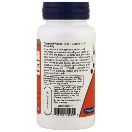NOW® Acetyl-L-Carnitine 500mg – Ацетил-L-Карнитин – питательный элемент, от которого зависит выработка ряда биоактивных соединений с уникальными свойствами для поддержания здоровья человека: